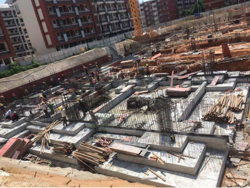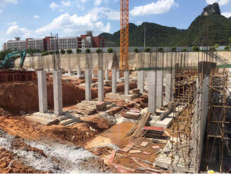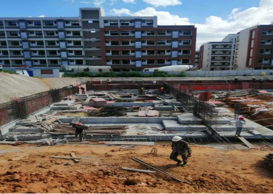 新校区扩建项目综合体育馆工程2021年08月份形象进度:完成B区基础施工、A区基础承台施工,正在进行A区基础柱柱钢筋绑扎、剪力墙钢筋绑扎。