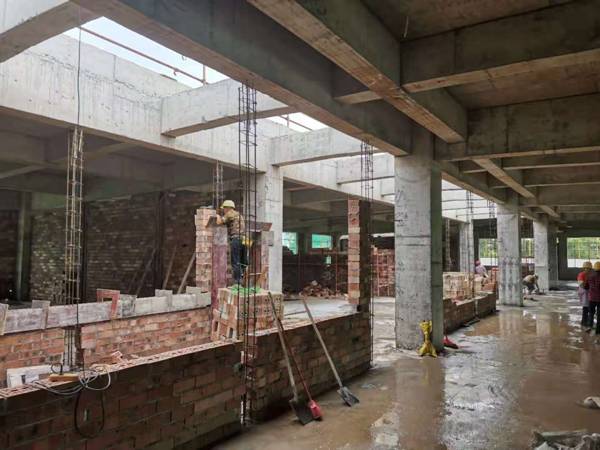 实训中心1`4#楼6月份进度:实训中心1#楼完成三层楼面钢筋绑扎,2#楼完成1~3层砖墙砌筑,3#楼完成1~3层砖墙砌筑, 4#楼完成二层楼面钢筋绑扎。