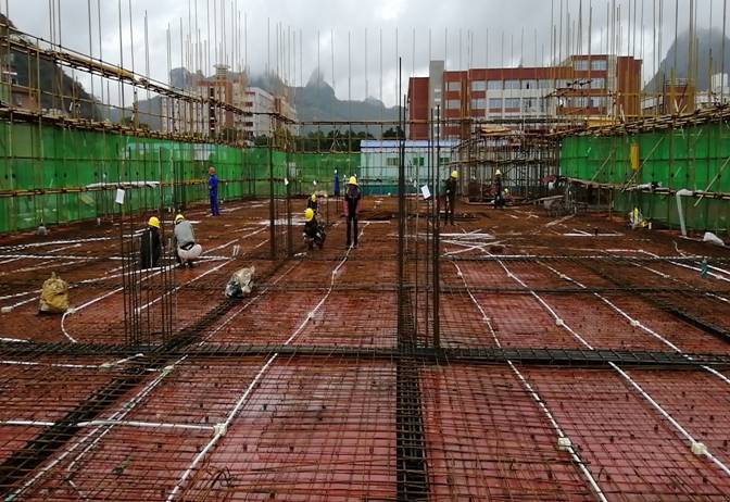 工人正在进行实训中心2#楼B区二层楼板钢筋绑扎