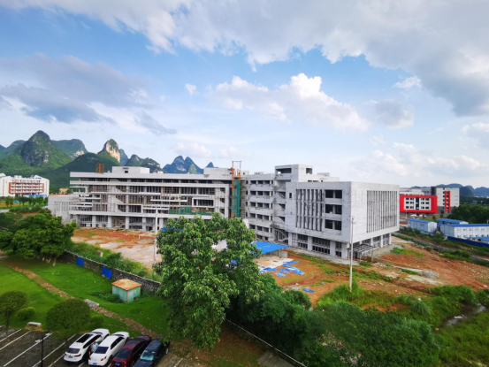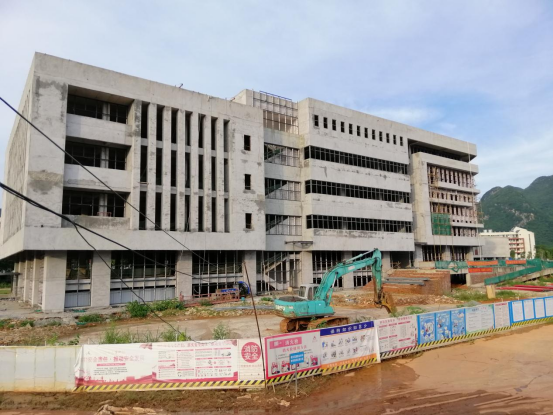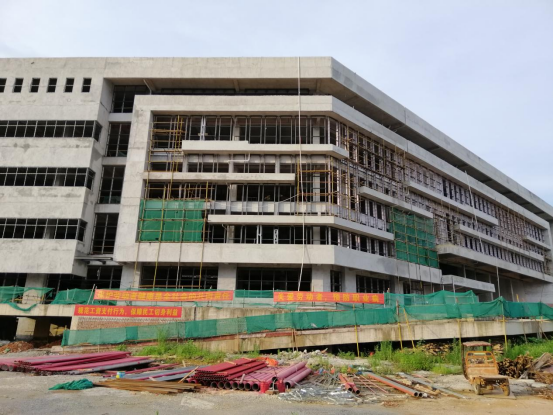 图书馆完成幕墙龙骨安装,窗框安装、消防管道安装,正在进行暖通管道安装。
