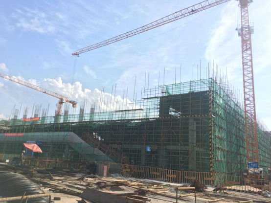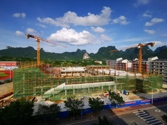 体育馆完成一层网球场结构施工、东西两侧看台结构施工,正在进行北侧看台结构施工。