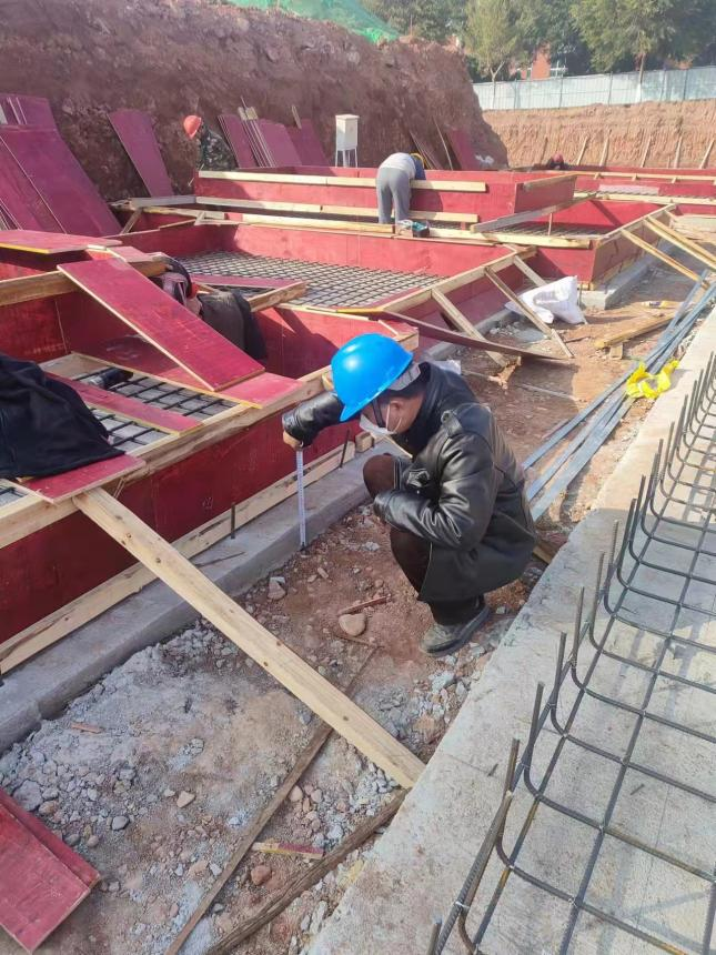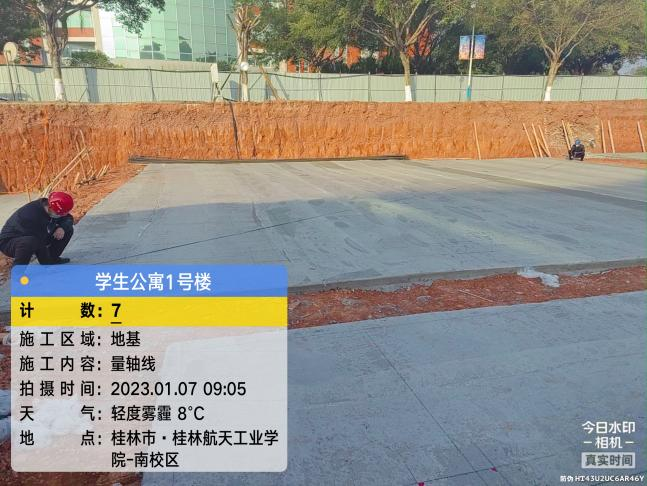 学生公寓1#楼2023年1月7日现场施工人员总共39人,其中管理人员8人,工人31人。当日主要进行的工作有:1、1#楼一区基础钢筋加工绑扎(完成20%);2、1#楼一区基础模板下料及安装(完成30%);3、现场封闭、临时项目部设施安装;4、1#楼基础验轴线;5、塔吊基础钢筋绑扎完毕。