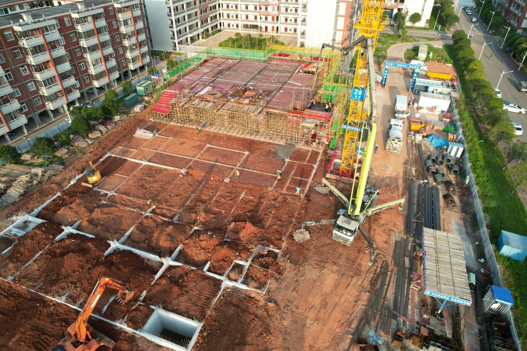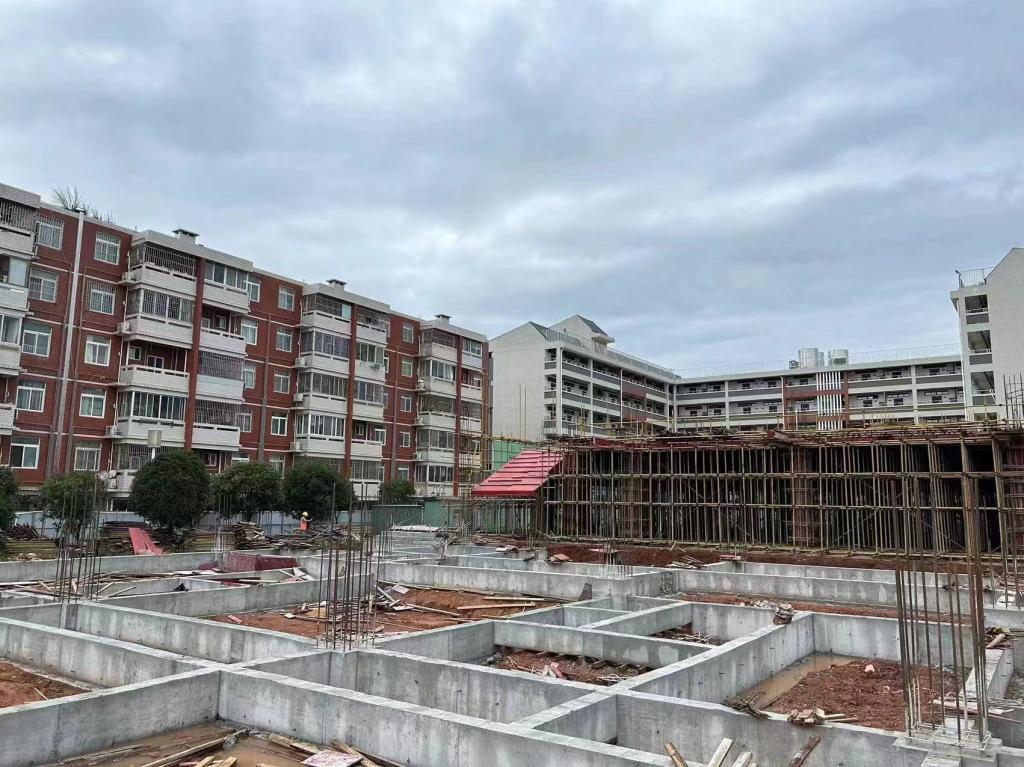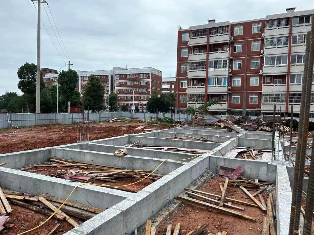 食堂2023年9月份主要完成了如下工作内容:首层地梁的浇筑及二层楼板模板和内架的搭设。