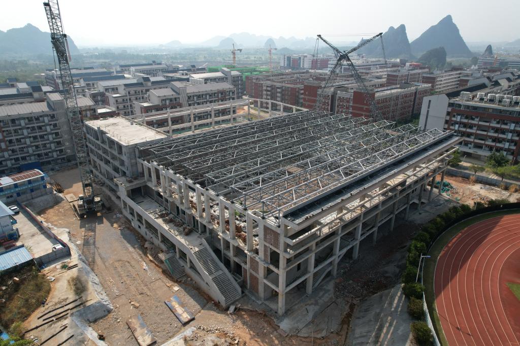 PA官方网站综合体育馆工程2023年11月份形象进度:完成B区7榀大梁的吊装,马道安装完成20%。
