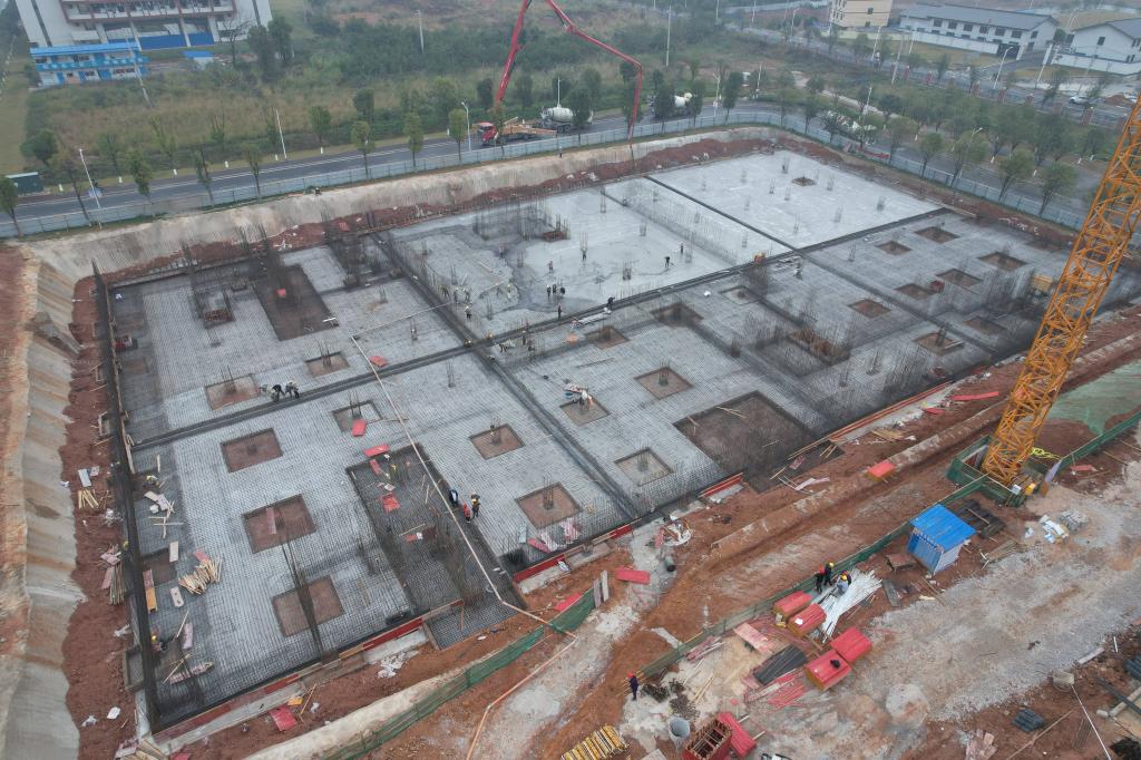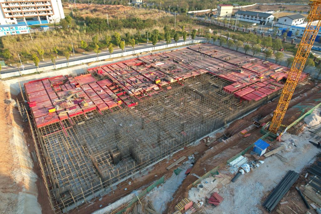 行政办公及院系教师办公楼12月份形象进度:完成地下室地板浇筑 剪力墙钢筋绑扎,人防门框安装,地下室满堂架施工。