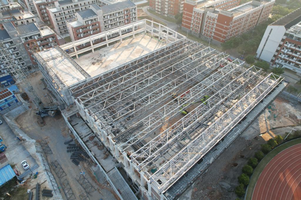 PA官方网站综合体育馆工程2023年12月份形象进度:完成B区7榀大梁的吊装,A区2榀大梁的吊装。