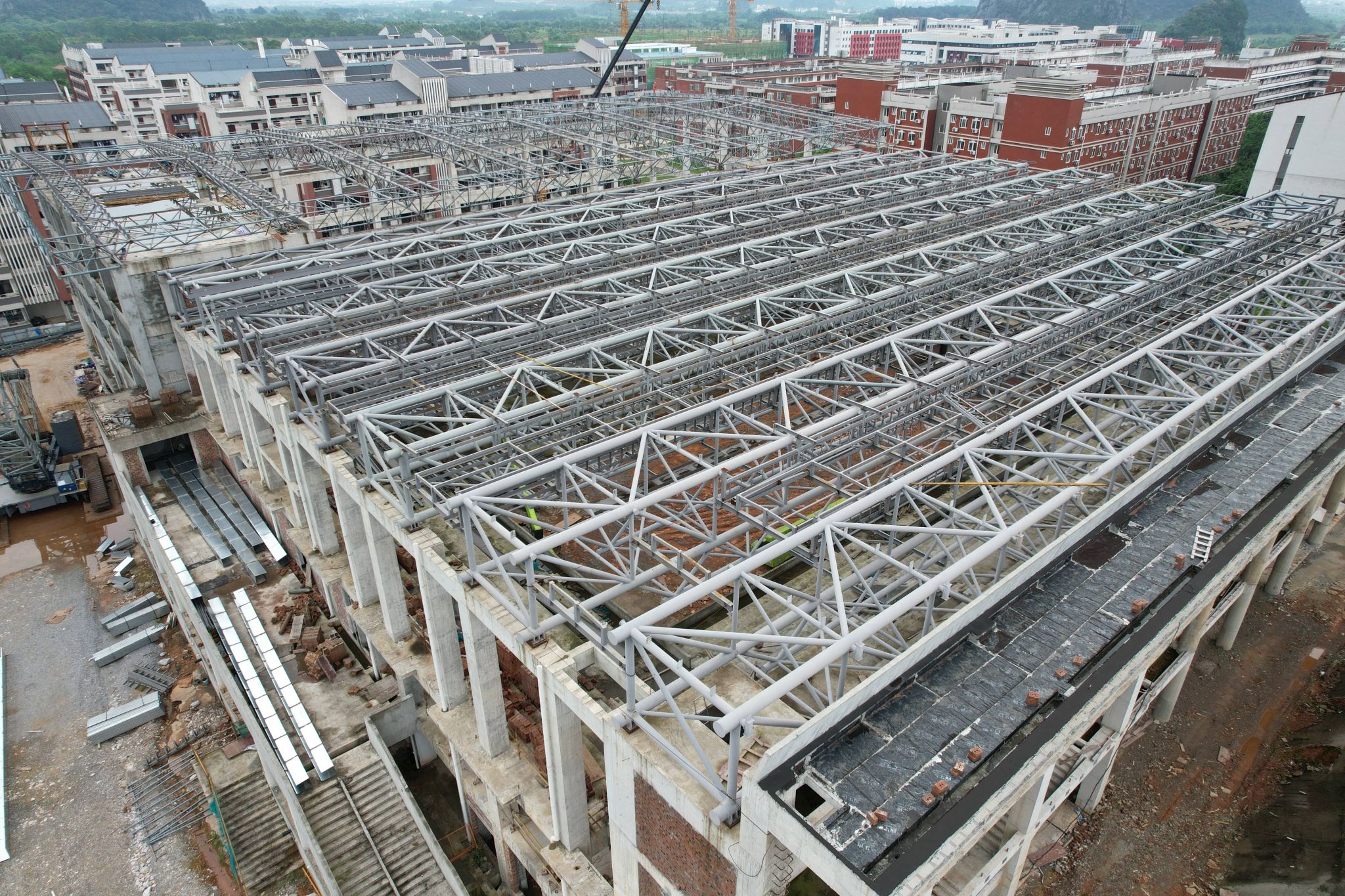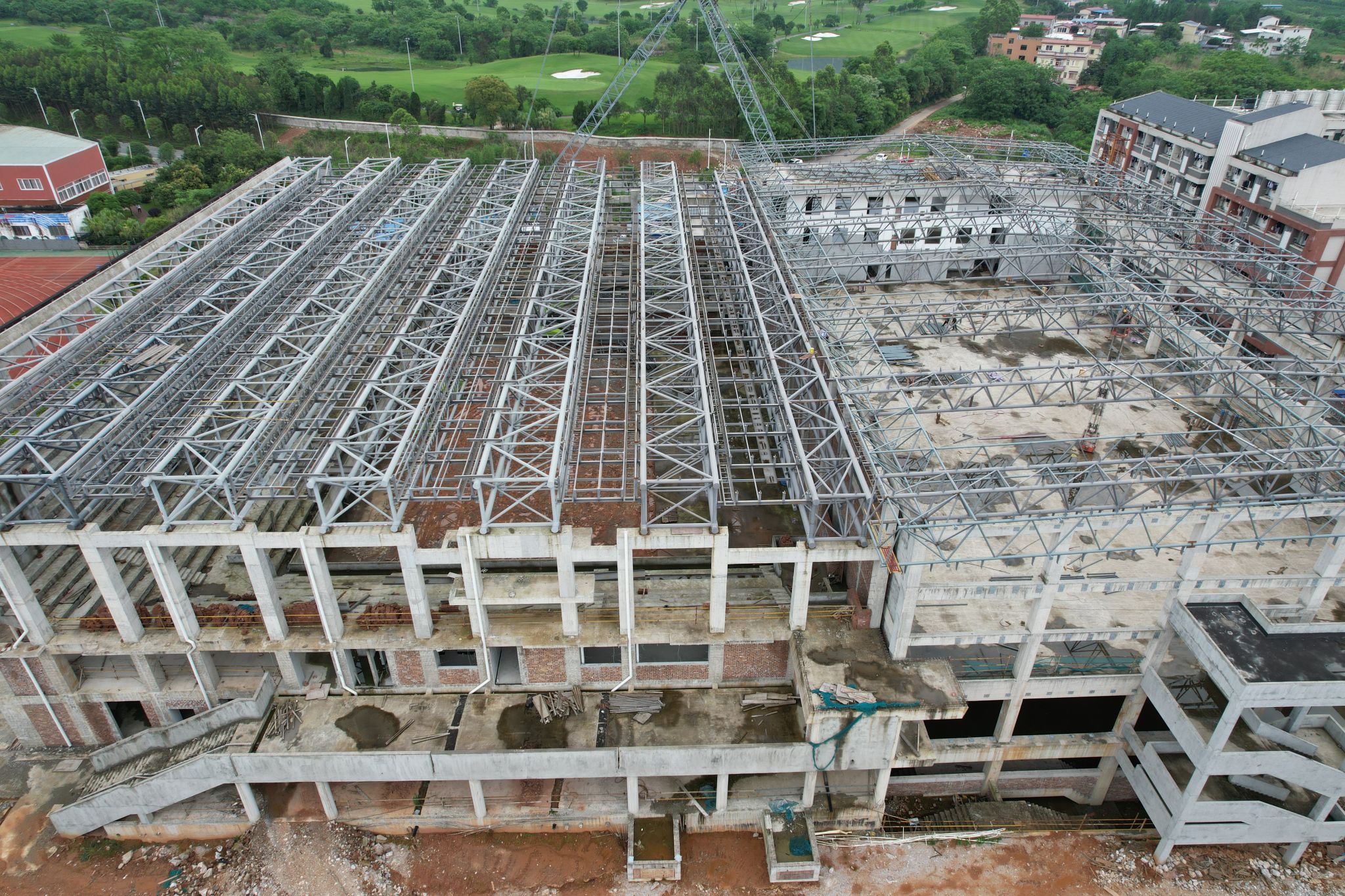 PA官方网站综合体育馆工程2024年4月份形象进度:完成钢桁架梁,正在施工天沟、檩条,完成幕墙预埋板,准备安装龙骨。
