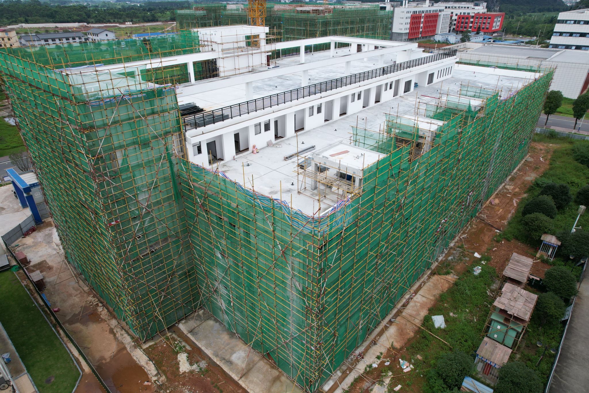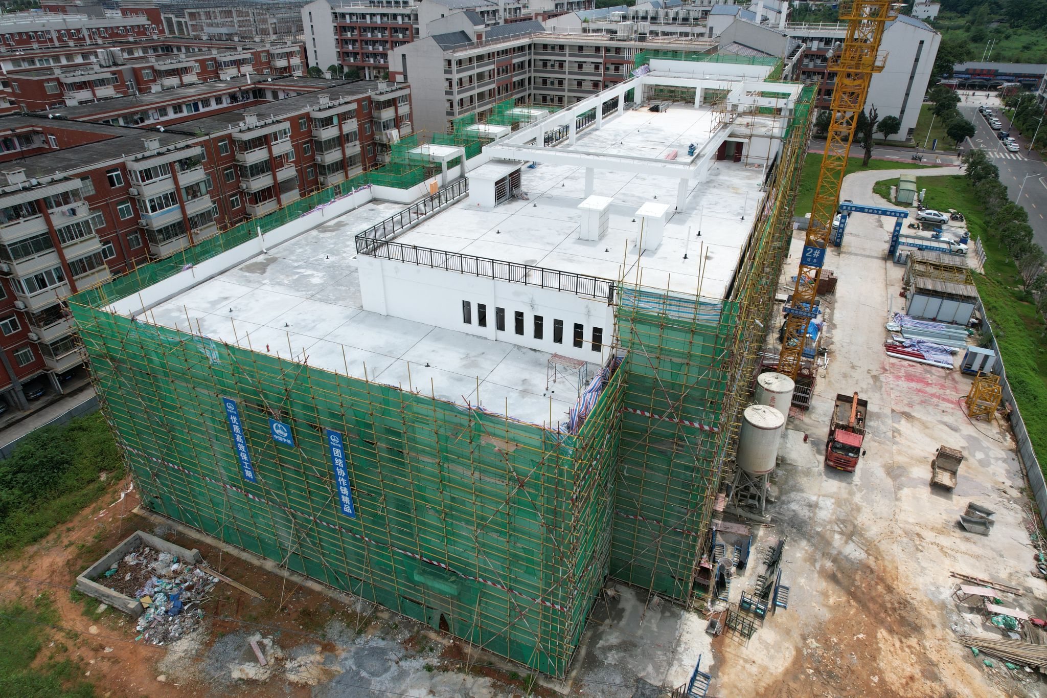 食堂2024年6月份主要完成了如下工作内容:完成室内装修完成至85%、消防完成至60%、外立面装饰完成至60%。