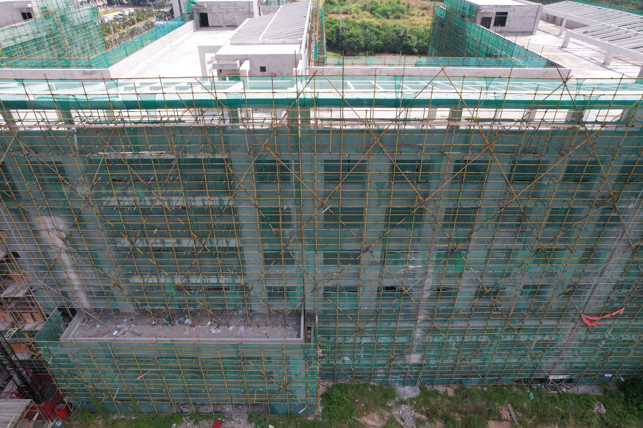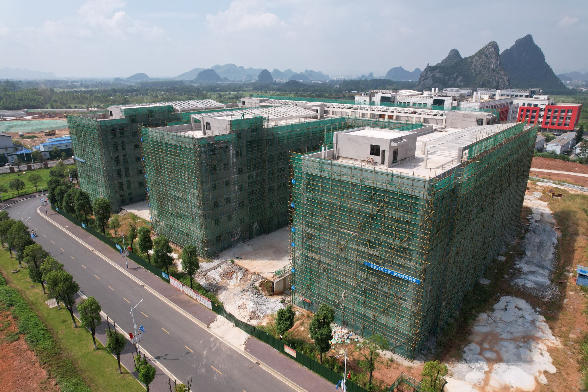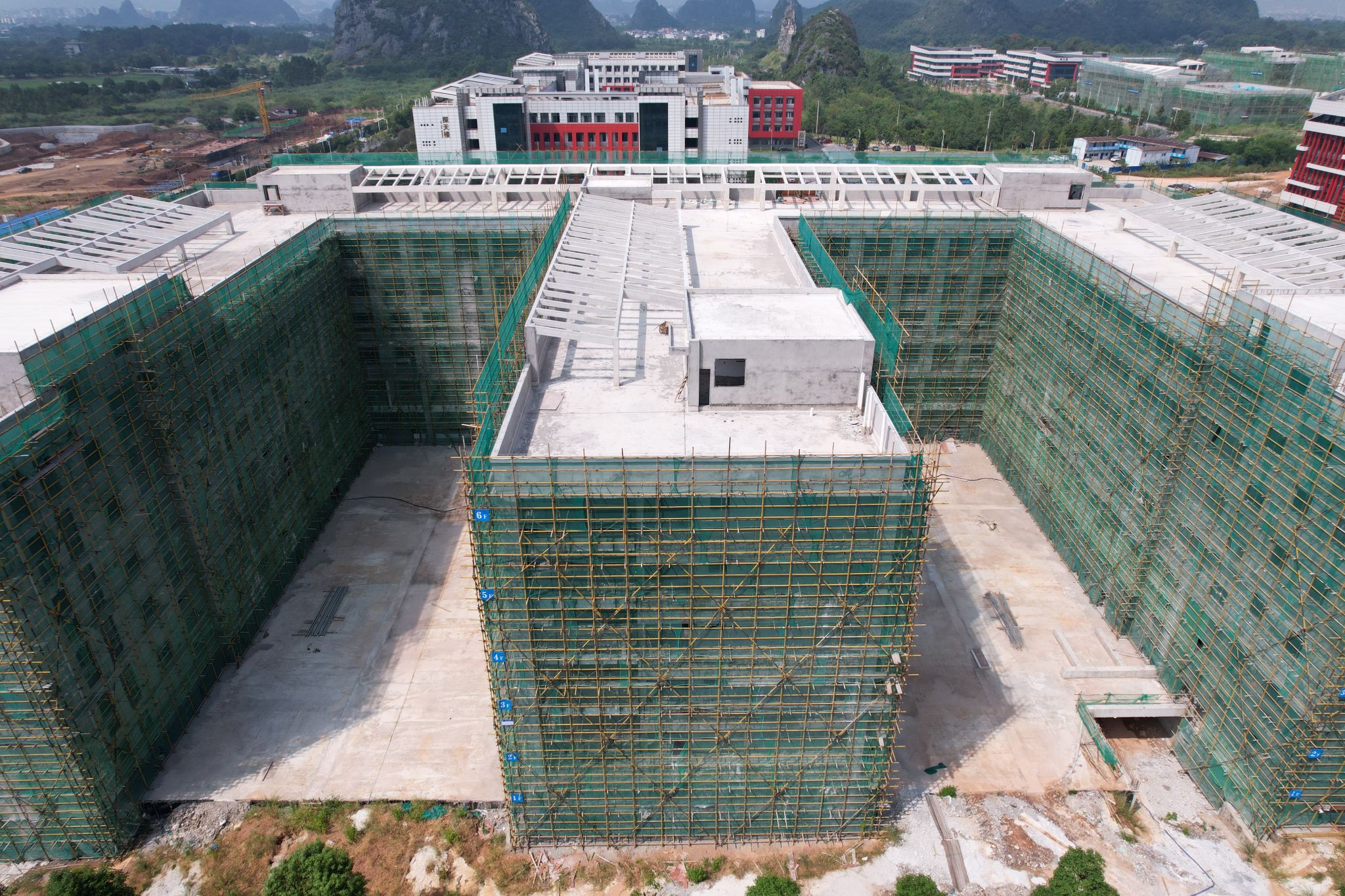行政办公及院系教师办公楼9月份形象进度:安装铝合金窗框80%,室内刮腻子,贴瓷砖完成10%。