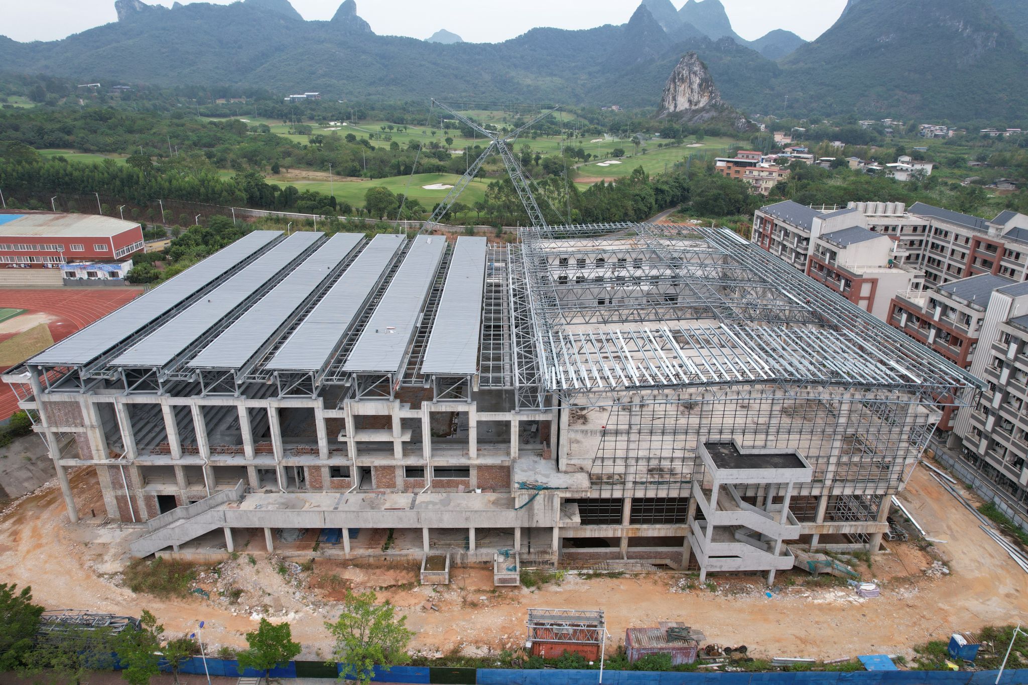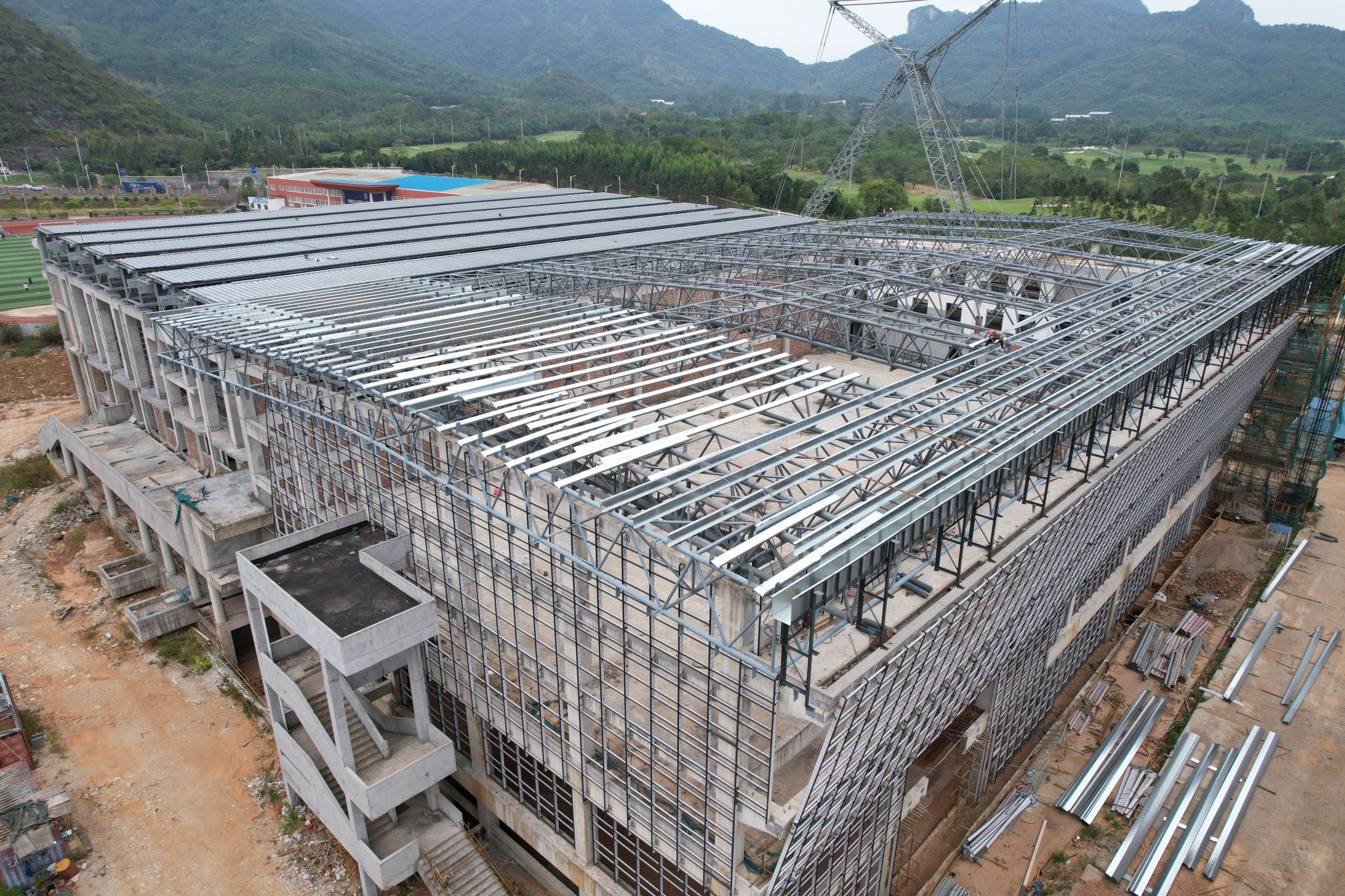 PA官方网站综合体育馆工程2024年10月份形象进度:A区正在进行檩条安装,B区进行刷防火涂料。