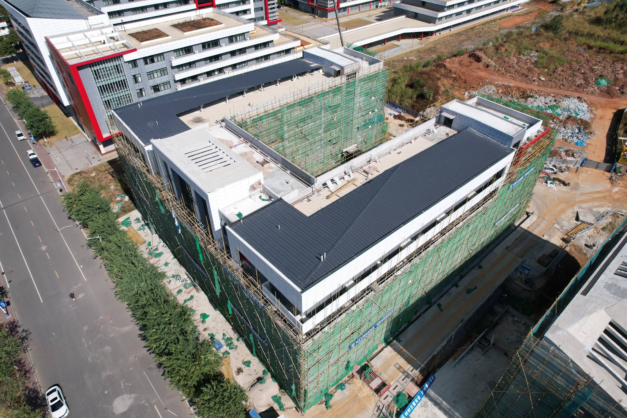 大学生创新创业中心2024年11月份主要完成了如下工作内容:正在进行外墙板,玻璃幕墙安装、水电及消防安装。