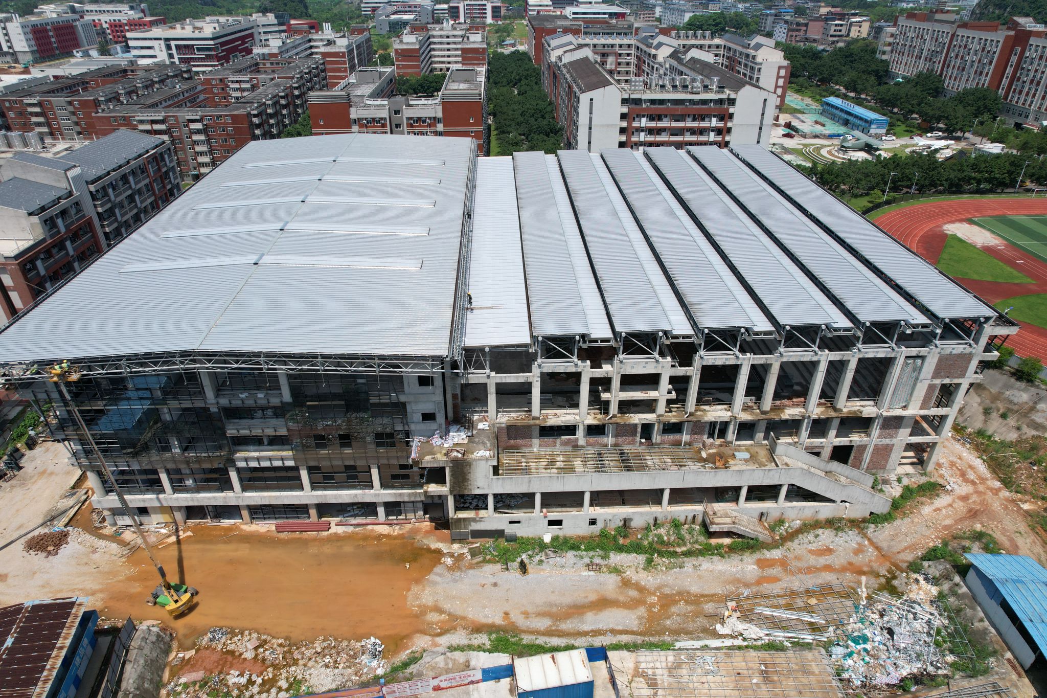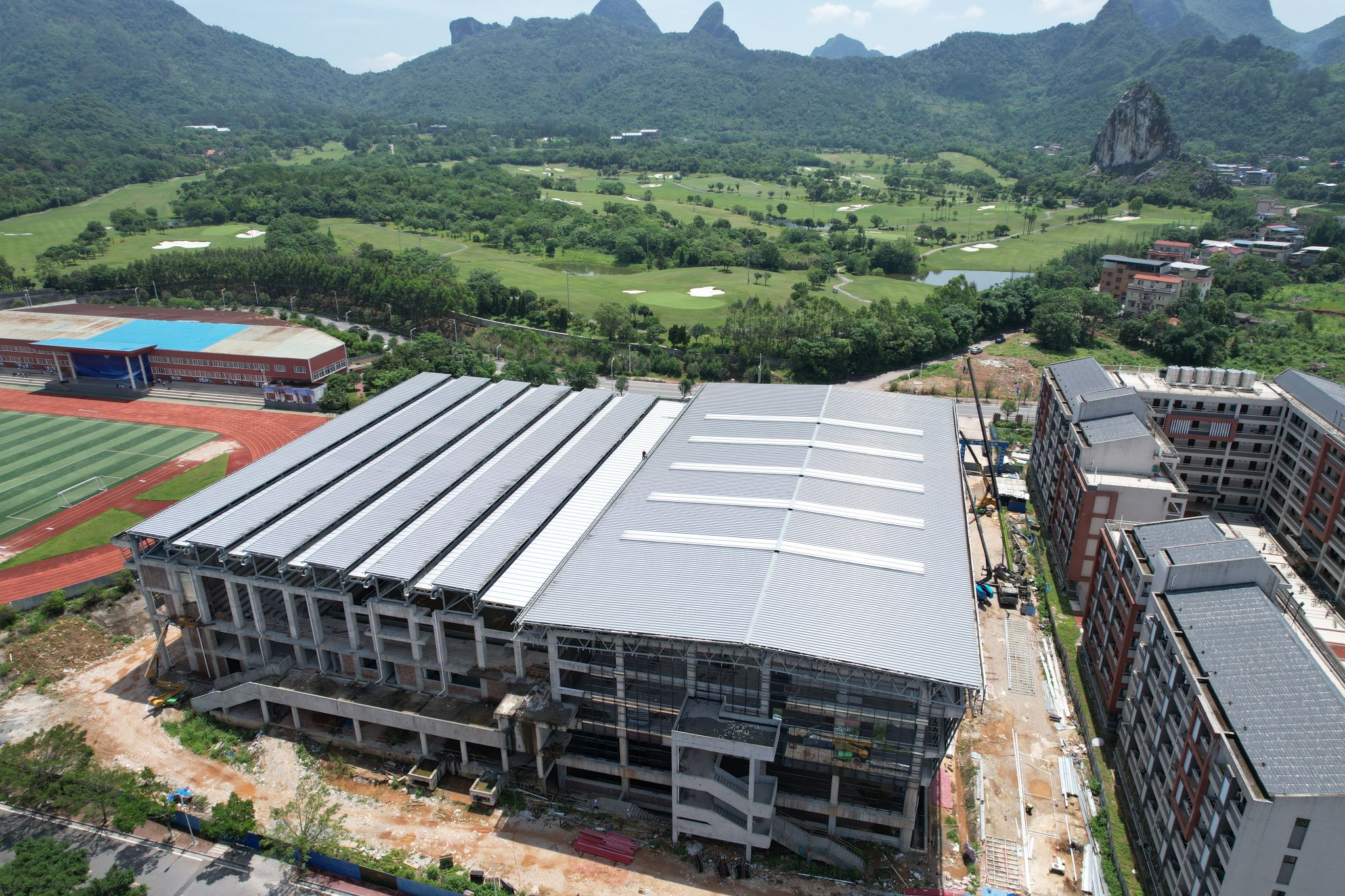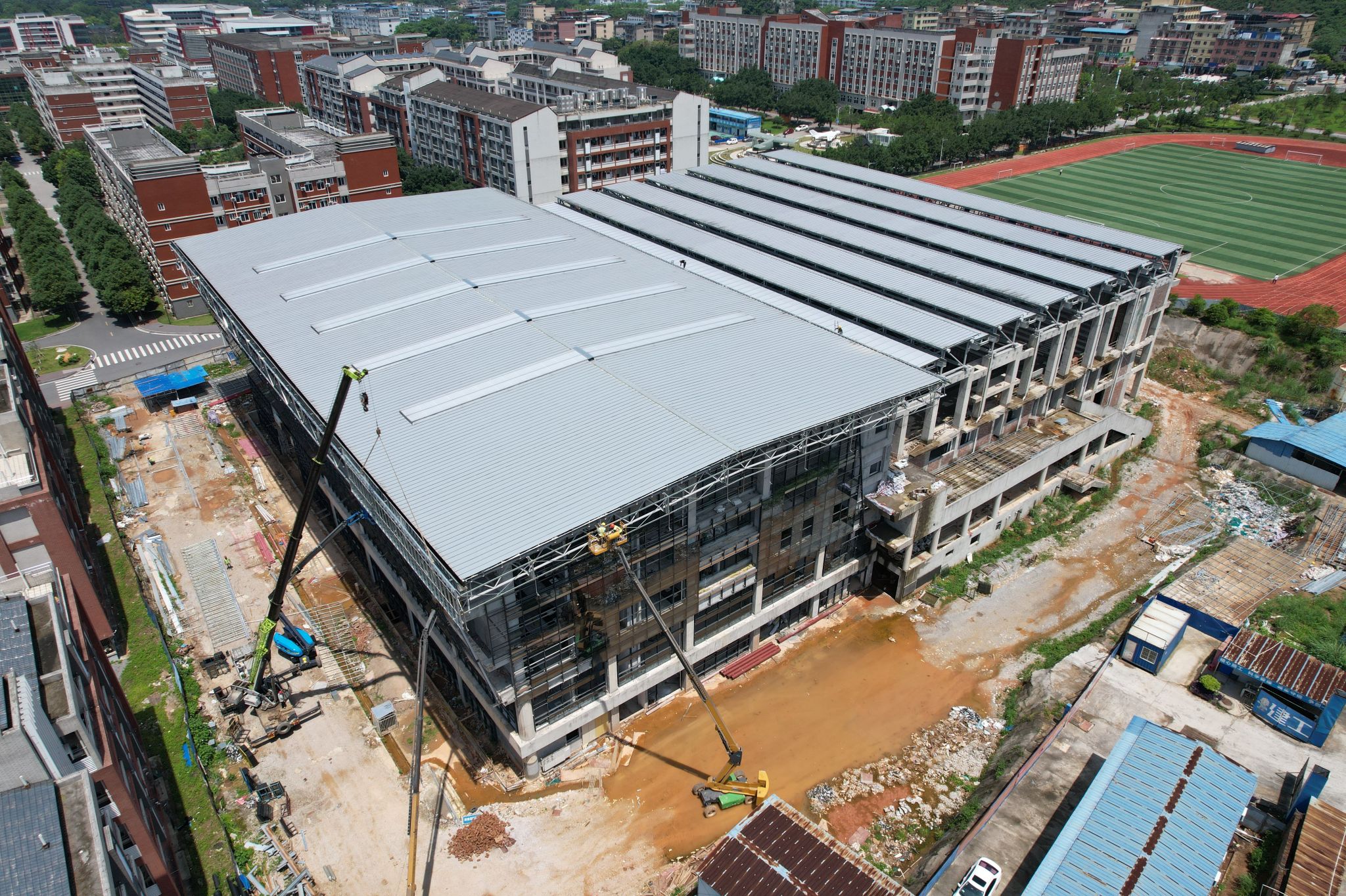PA官方网站综合体育馆工程2025年5月份形象进度:主要进行幕墙玻璃安装、卫生间地砖铺装、消防管道安装、一体化龙骨安装、顶棚批白。