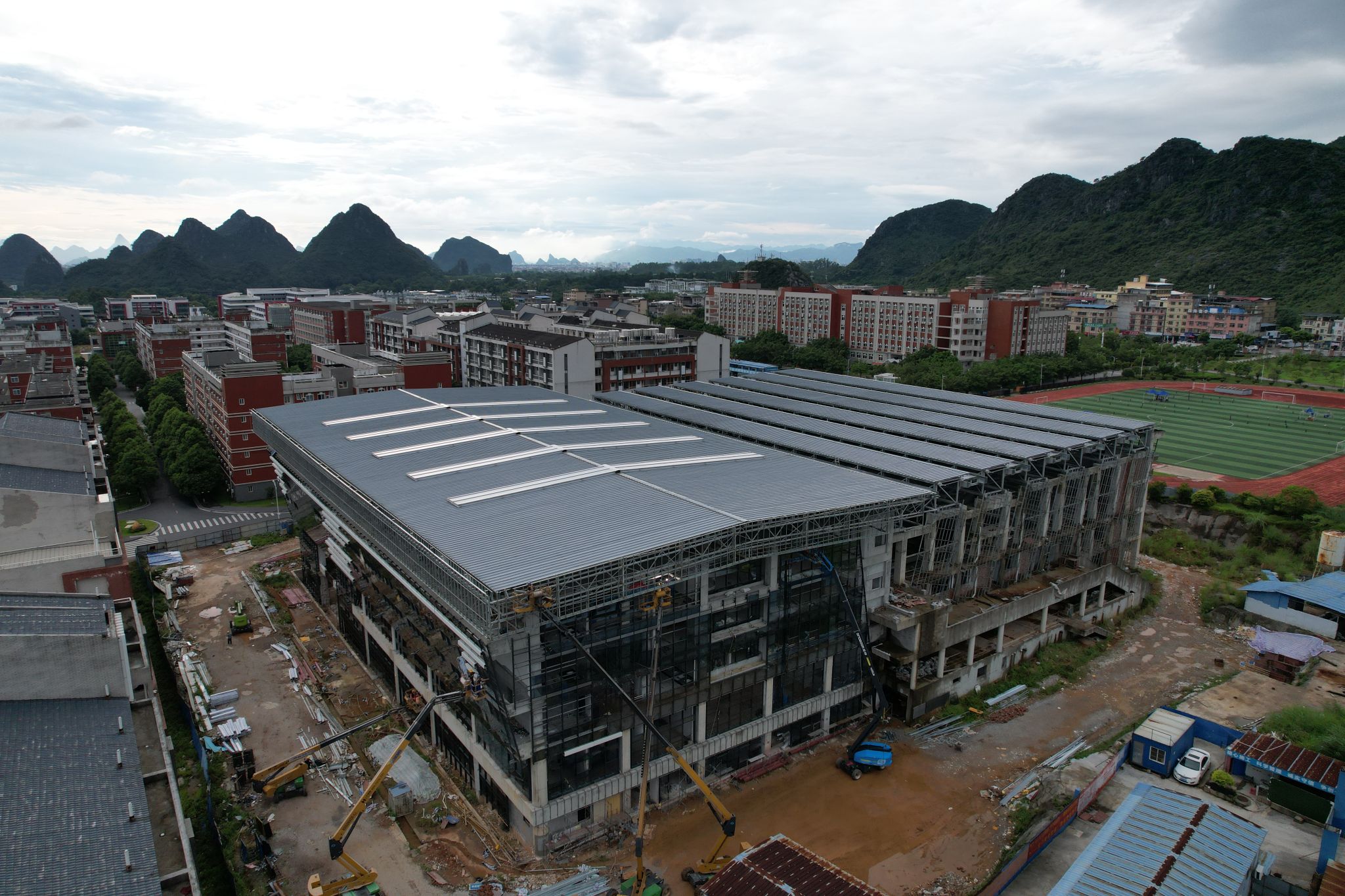PA官方网站综合体育馆工程2025年7月份形象进度:正在进行幕墙安装、一体化板龙骨施工、栏杆扶手安装、云浮式吸音体吊顶安装、装饰线条安装。